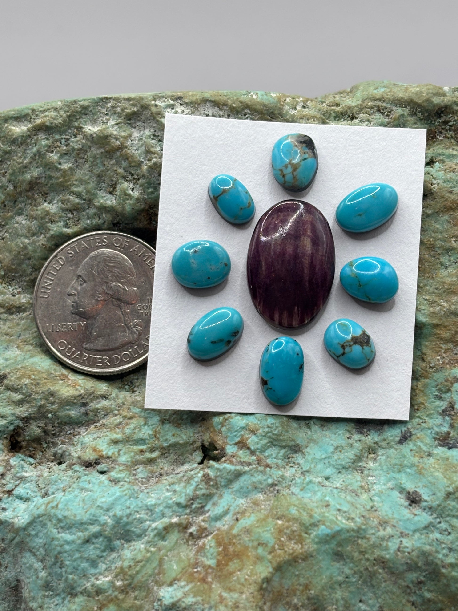 8 Sonoran Turquoise Cabochons backed, 1 Purple Spiny Oyster Cabochon Unbacked