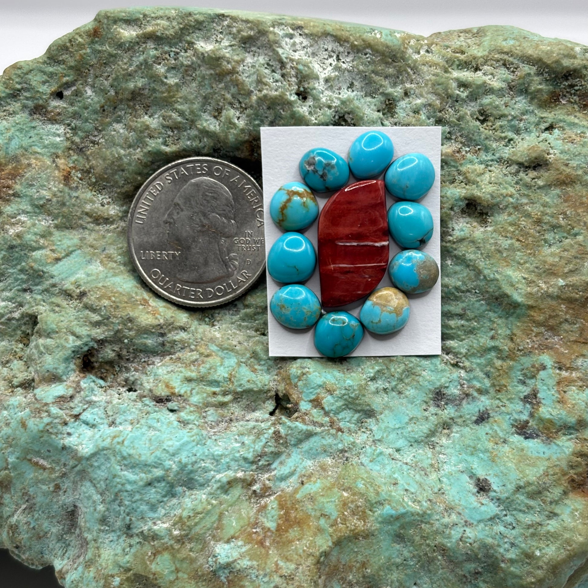 10 Sonoran Turquoise Cabochons backed, 1 Red Spiny Oyster Cabochon Unbacked